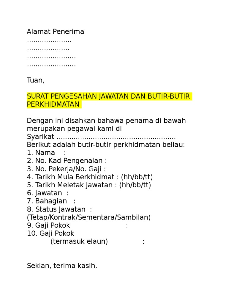 Surat pengesahan ini hanya bagi tujuan permohonan menyertai program penggajian dan penempatan semula pendatang. Namun jika perseorangan sudah meninggalkan surat sebagai media komunikasi, tidak demikian dengan perusahaan, instansi pemerintahan, maupun. Surat pengesahan majikan (potongan gaji). Contoh surat keterangan kerja (untuk paspor). By nurzaihan manzuki 52211 views.